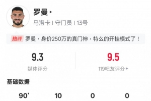体育资讯5月15日讯 西甲第36轮,马洛卡1-2不敌皇马。马洛卡门将罗曼本场比赛首发出战,10次扑救全场最多,评分9.3全场最高。