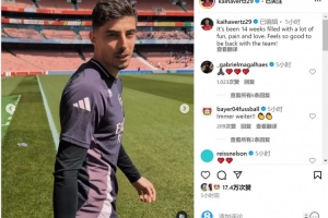 哈弗茨社媒写道:“这是充满欢乐、痛苦和爱的14周,回到球队的感觉真好!”
