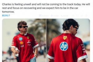 F1本周展开艾米利亚-罗马涅大奖赛的争夺,据法拉利车队官方消息,勒克莱尔身体不适,今天不会来到赛道。该车队同时表示,勒克莱尔会休息并专注于恢复,预计明天可以上车。