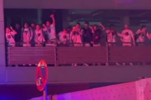 据科贝电台报道,巴萨全队已经返回甘伯体育城,球员们来到阳台上,与球迷一起庆祝夺冠。