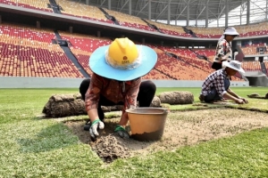 负责本次赛事草坪保障工作的深圳市嘉美茵体育工程技术有限公司总经理张小焕介绍,之所以不直接移栽到足球场内养草,主要是因为足球场为半封闭建筑,对阳光和空气流动性的阻挡会影响草的生长。本场比赛选择的是百慕大系列里的耐阴性草种,35摄氏度以上仍能旺盛生长,根系较深,适合重庆天气。且能为球员奔跑提供强韧支撑,叶片质地细腻,滚动摩擦系数小,能确保足球高速滚动时轨迹的稳定性。移植工作完成后,草坪上还将覆盖一层细沙,局部找平,再进行打药、防病、施肥等养护工作。