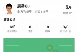 体育资讯3月30日讯 西甲第29轮,皇马主场迎战莱加内斯,居勒尔首发出战,1次制造点球,送出4次关键传球,传球成功率达到了93.5%,评分8.4。