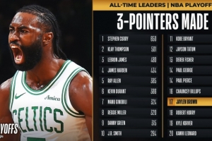 首节布朗命中2记三分,生涯季后赛三分数来到262个,超越罗伯特-霍里升至历史第17位。