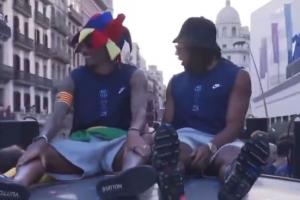 在游行大巴上,拉菲尼亚和孔德装扮引人注意,孔德还做了个投篮手势。