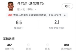 体育资讯3月24日讯 欧国联1/4决赛次回合,意大利客场3-3德国,总比分4-5不敌对手无缘4强。丹尼尔-马尔蒂尼本场首发出战45分钟,赛后获评6.5分。