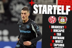 勒沃库森首发:1-赫拉德茨基、3-因卡皮耶、4-若纳坦-塔、7-霍夫曼、10-维尔茨、12-塔普索巴、14-希克、19-泰拉、20-格里马尔多、24-阿莱克斯-加西亚、25-帕拉西奥斯