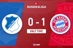 上半场伤停补时1分钟,半场结束,拜仁暂1-0霍芬海姆。