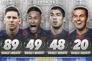 14/15赛季(进球+助攻):梅西(89)、内马尔(49)、苏亚雷斯(48)、佩德罗(20)