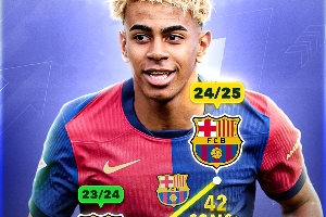 17岁亚马尔:24/25赛季直接参与42球(进球+助攻)