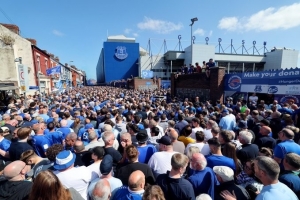 体育资讯5月18日讯 英超官方晒图,许多埃弗顿球迷到古迪逊公园球场聚集,准备告别这座历史悠久的球场。