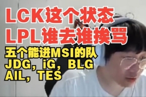 BLG现在还有机会进MSI吗?有的,就进了淘汰赛的话就是众生平等了,我说五个能进MSI的队,应该大概率就这五个队,jdg,iG,BLG AlL,TES就这五个队,其他的不太可能五出二吧差不多,原本JDG跟IG不在我的考虑范围之内的,现在这俩也可以加上了,原本我觉得就BLG跟TES能进,但是最近比赛看一下的话感觉都能进,TES跟BLG起伏也挺大的,但目前来看的话LCK这个状态,感觉谁去谁挨骂,就感觉谁去谁要被写歌。