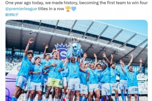 体育资讯5月19日讯 曼城官方更新社媒动态,回顾去年的今天达成英超四连冠。