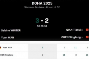 体育资讯5月19日讯 在刚刚结束的多哈世乒赛女双第二轮中,中国选手陈幸同/钱天一经过五局争夺不敌德国组合温特/万远,止步世乒赛女双32强。
