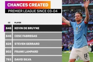 据OptaJoe的数据统计,自Opta有记录以来(2003-04赛季开始),德布劳内在英超联赛中为队友创造846次机会,没有哪名球员比他更多。