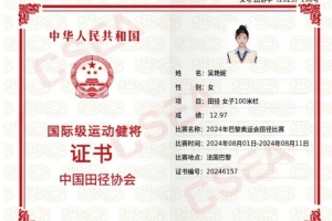 收到了巴黎奥运会的国际健将证。我在2018年就达标了国际健将,但我只想用奥运会的成绩来办国际健将证,因为我坚信我会参加奥运会,不是奥运会的国际健将证我宁愿没有;我在2015年就达标了一级运动员,但我从没办一级运动员证,因为我相信我肯定会是健将。