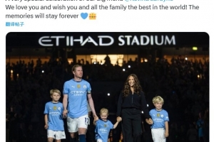 体育资讯5月21日讯 德布劳内在英超第37轮曼城3-1战胜伯恩茅斯的比赛中完成了他在曼城主场的最后一场比赛,比赛结束后,曼城中场B席在社交媒体中发文,对德布劳内进行了告别和祝福。
