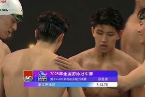 体育资讯05月22日讯 全国游泳冠军赛男子4×200米接力决赛,浙江队派出了汪顺、费立纬、孙杨和潘展乐的豪华阵容,这四人中有三人拿到过奥运会冠军。最终浙江队以7分12秒76的成绩轻松夺冠。