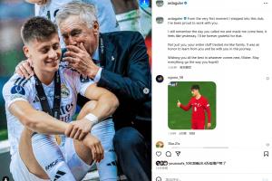 体育资讯5月24日讯 皇马官宣安切洛蒂今夏离任,居勒尔在个人社媒发文与安帅告别。
