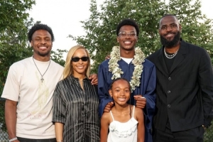 詹姆斯夫妇的小儿子布莱斯昨日高中毕业,詹姆斯全家参加了布莱斯的毕业典礼并合影留念。