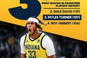截至发稿,特纳送出2次盖帽,季后赛盖帽数107个超越希伯特,升至步行者队史第二位,拍在他前面的是戴尔-戴维斯的119个,排名第一的是小奥尼尔的120个。