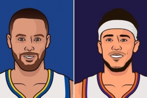 “库里赛季场均24.5分6.0助攻,投篮命中率44.8%,入选最佳阵容二阵;布克赛季场均25.6分7.1助攻,投篮命中率46.1%,无缘最佳阵容。”StatMuse写道。