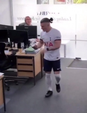 😅热刺加冕欧联杯后,这位热刺球迷全副武装地去上班,给他的曼联球迷老板一个惊喜……