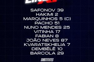 巴黎首发:39-萨福诺夫、2-阿什拉夫、5-马尔基尼奥斯、51-帕乔、25-努诺-门德斯、17-维蒂尼亚、8-法比安、87-内维斯、7-克瓦拉茨赫利亚、10-登贝莱、29-巴尔科拉