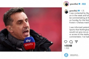 曾批评诺丁汉森林老板马里纳基斯的内维尔被禁止入场解说比赛,内维尔在社交媒体上发文谈到了这一话题。
