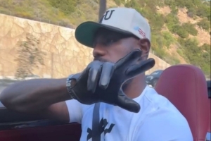 詹姆斯转发了他的朋友发布的一段自拍,他和友人坐在一辆敞篷跑车上前往郊区兜风,车上音响同时播放着音乐。