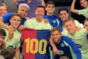 莱万加盟巴萨至今出战147场比赛,打进101球(20助),赛后他获赠巴萨生涯百球里程碑纪念球衣,并手拿球衣与队友们在更衣室内合影。