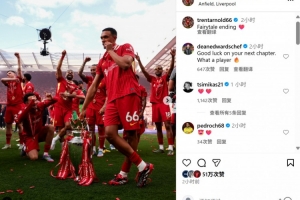 本场比赛阿诺德替补登场完成红军告别战,他在个人社媒也晒出与众队友庆祝夺冠的合照,配文写道:“童话般的结局❤️”