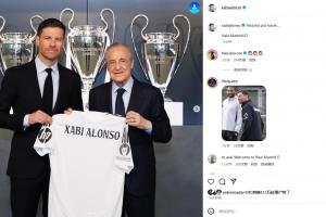体育资讯5月27日讯 不久前,皇马新帅哈维-阿隆索更新了社交媒体,晒出了自己与弗洛伦蒂诺手持皇马球衣的合照。