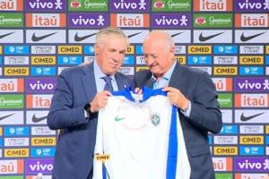 曾在2002年带领巴西夺得世界杯的76岁斯科拉里到场,给65岁的安切洛蒂送上了一件教练服。