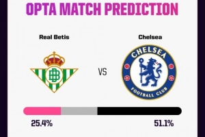 结果显示,切尔西90分钟内赢得决赛的概率为51.1%,贝蒂斯为25.4%,需通过加时甚至是点球大战才能决出最终冠军的概率为23.5%。