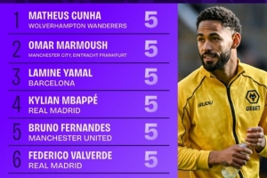 体育资讯5月27日讯 欧洲五大联赛均以落幕,数据网站Squawka统计了2024-25赛季五大联赛球员禁区外破门次数排行榜,库尼亚、马尔穆什、姆巴佩、亚马尔等人都打进5粒禁区外进球。