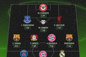 亚马尔(巴塞罗那)评分:8.01,维尔茨(勒沃库森)评分:7.50,穆西亚拉(拜仁慕尼黑)评分:7.56,拉菲尼亚(巴塞罗那)评分:7.62