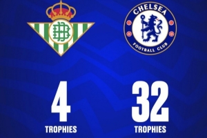 OneFootball在赛前对比了两队队史荣誉,贝蒂斯4冠,切尔西共获32冠。