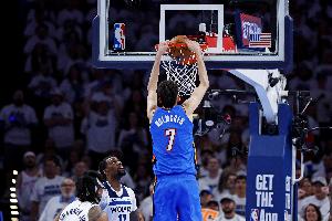 体育资讯5月29日讯 NBA季后赛,雷霆124-94大胜森林狼,总比分4-1挺进总决赛。