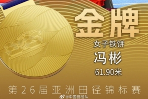 体育资讯5月29日讯 第26届亚洲田径锦标赛女子铁饼决赛,冯彬以61.90米斩获金牌。