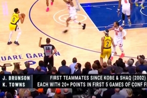 据统计,唐斯和布伦森在分区决赛的前五场比赛中每场比赛皆砍20+,自2002年的科比和奥尼尔以来首对队友。