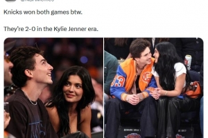 美媒NBA Memes晒出一组趣味数据,当凯莉-詹娜陪男友甜茶现场看球时,尼克斯的战绩为2胜0负。