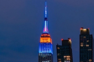 赛后,纽约地标建筑帝国大厦亮灯,庆祝尼克斯逃过一劫。