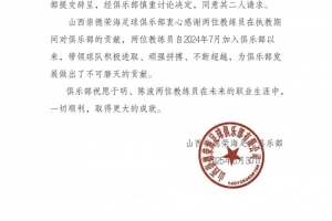 山西崇德荣海足球俱乐部衷心感谢两位教练员在执教期间对俱乐部的贡献,两位教练员自2024年7月加入俱乐部以来,带领球队积极进取、顽强拼搏、不断超越,为俱乐部发展做出了不可磨灭的贡献。