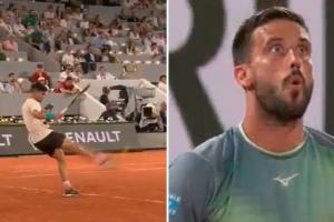 其中一球,阿尔卡拉斯在回球时出界,裁判喊出判罚后,阿尔卡拉斯直接一脚凌空抽射把球踢飞了!对手德祖赫表情也惊呆了。