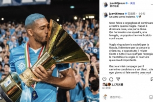 胡安热苏斯社媒:代表那不勒斯是一种荣誉,再战一年是巨大的喜悦