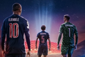 巴黎官方社媒发布了为决赛制作的海报,内容为登贝莱、马尔基尼奥斯、多纳鲁马走向安联球场。