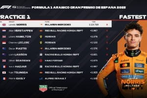 体育资讯5月31日讯 F1西班牙大奖赛一练结束,迈凯伦车手诺里斯全场最快,维斯塔潘P2,汉密尔顿P3。