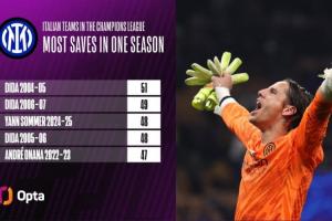 体育资讯06月01日讯 索默在本赛季欧冠联赛中已经完成了48次扑救。