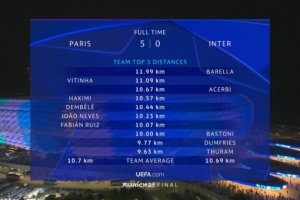 体育资讯6月1日讯 欧冠决赛,大巴黎5-0击败国米夺得冠军。跑动距离统计方面,巴雷拉11.99公里全场最高,维蒂尼亚11.09公里则是巴黎最高。巴黎平均跑动10.7公里,国米10.69公里。