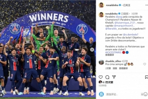 罗纳尔迪尼奥社媒晒出巴黎捧杯的照片,祝贺老东家夺冠,他写道:“祝贺巴黎夺得欧冠冠军!!!祝贺纳赛尔、恩里克、我们的队长马尔基尼奥斯、贝拉尔多,以及所有球员!!!”